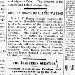 It mentions the death of Jennie Watson, Mrs. J.F. Hardy, a popular Scottish vocalist. Given that her married surname was Hardy and that this was published in a Streetsville newspaper, it had me wondering if there was a connection to my Hardy family.